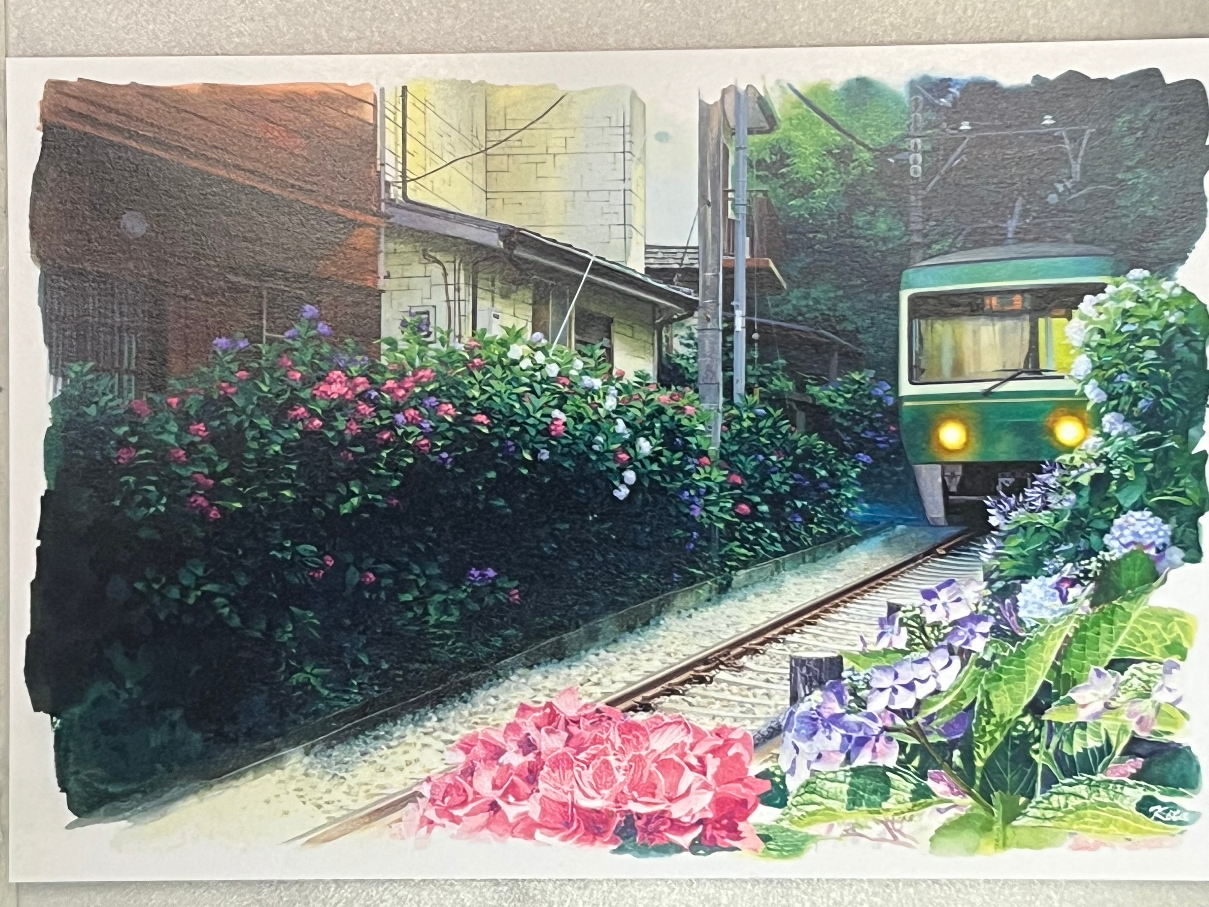 アジサイの花が咲き誇る御霊神社前を江ノ電が走る風景は、訪れる人々に心和むひとときを提供します。豊かな自然に包まれたこの景色は、お部屋のインテリアやデスク周りを華やかに彩り、心に安らぎをもたらしてくれるでしょう。