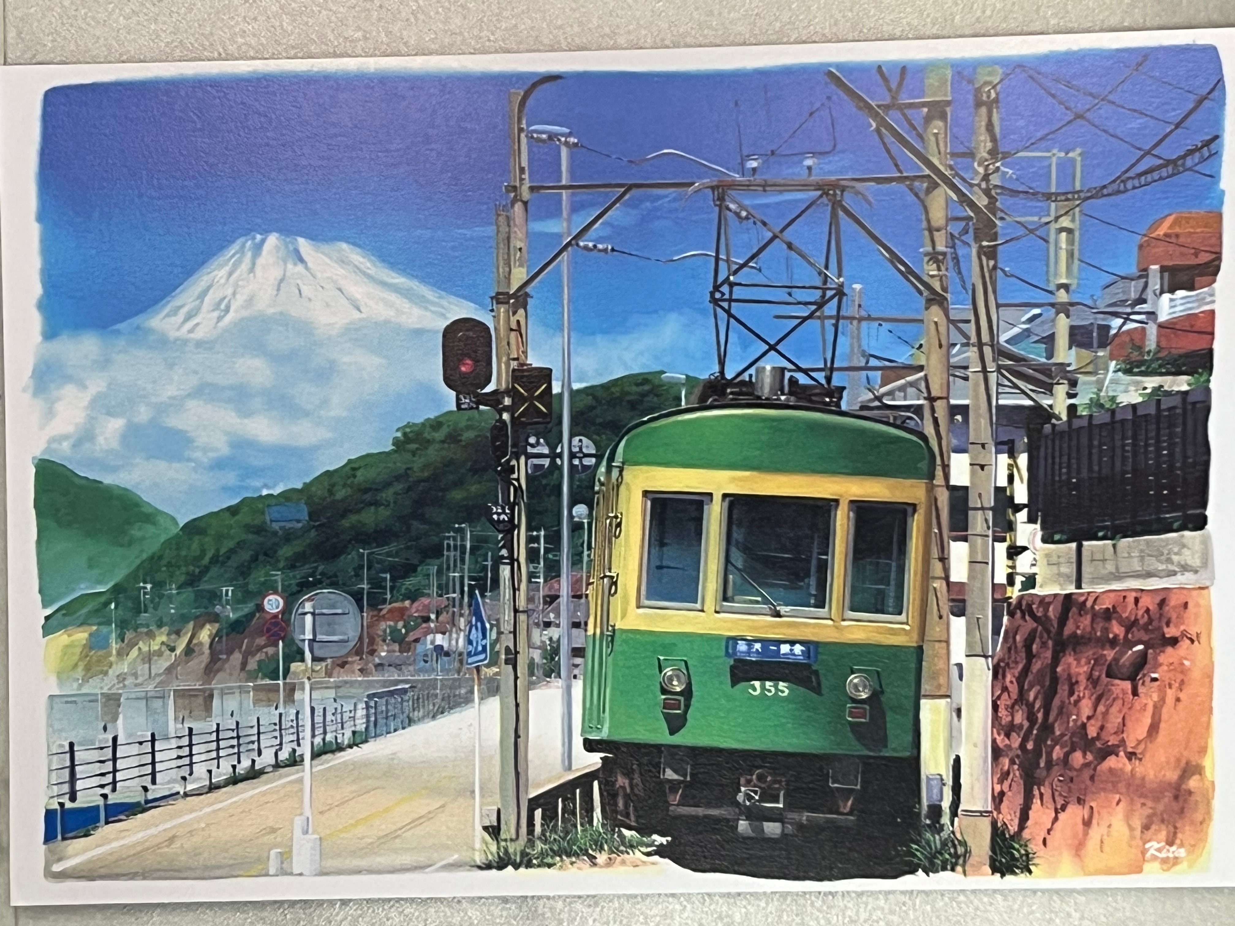 このポストカードは、顕証寺前からの雄大な富士山とともに走る江ノ電の美しい風景を見事に表現しています。